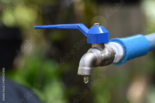 blue water faucet with water dripping .