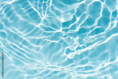 Blue water with ripples on the surface. Defocus blurred transparent blue colored clear calm water surface texture with splashes and bubbles. Water waves with shining pattern texture background.