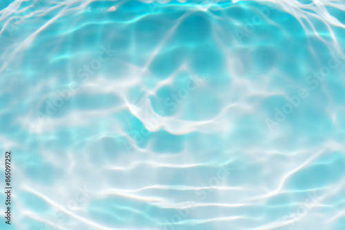 Blue water with ripples on the surface. Defocus blurred transparent blue colored clear calm water surface texture with splashes and bubbles. Water waves with shining pattern texture background.