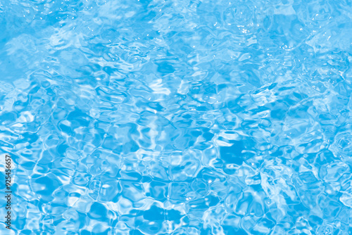 Blue water with ripples on the surface. Defocus blurred transparent blue colored clear calm water surface texture with splashes and bubbles. Water waves with shining pattern texture background.