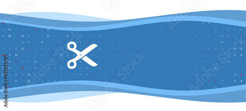 Blue wavy banner with a white scissors symbol on the left. On the background there are small white shapes, some are highlighted in red. There is an empty space for text on the right side