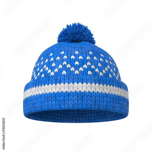 Blue winter knitted hat with a pattern isolated on a white background, 3D render