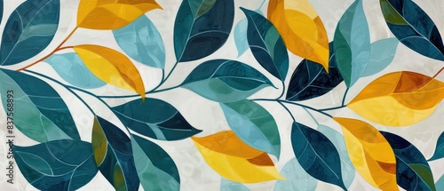 blue, yellow, leaf, painted, white background, art, botanical, foliage, nature, vibrant, colourful, white, background, artistic, illustration, leafy, design, element, plant, flora, colours
