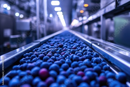 blueberry, conveyer belt, food processing, factory, industry, agriculture, farming, harvest, production, manufacturing, technology, automation, machinery, equipment, sorting, cardboard box, logistic, freshness, quality control, sanitation, hygiene, berry, fruit, food, commercial, industrial, mass production, processing plant, efficiency, productivity, innovation, business, economy