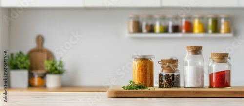 blur background of a wooden kitchen counter with spices and a white minimal interior in blurred focus.