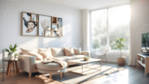 Blur living room at home with morning sunlight at big window for background usage. blur interior background concept. white, bright tone. Generative AI