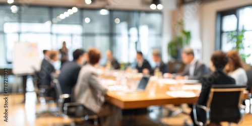 Blur office meeting blurred background with business people working group in boardroom discussion, executive seminar or professional training in enterprise. High quality