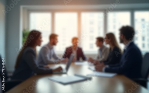 Blur office meeting blurred background with business people working group in boardroom discussion for teamwork brainstorming, executive seminar or professional training in small startup enterprise