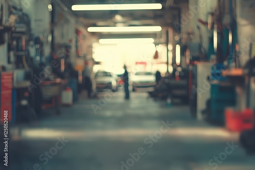 Blurred auto repair shop interior with mechanic.