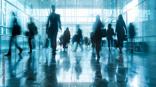 Blurred background. A dynamic crowd can be observed in a modern glasscovered space, bustling and lively