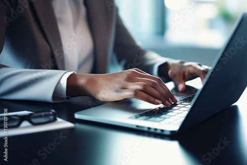 Blurred businesswoman hands typing on laptop keyboard in office.
