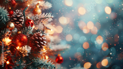 Blurred Christmas glitter bokeh background with pine tree branches, pine cones, red berries, Christmas balls.