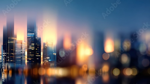 Blurred city skyline at dusk reflecting on water, showcasing vibrant lights and urban ambience