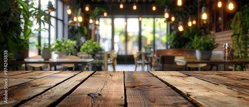 Blurred coffee shop and restaurant interior background with empty wooden table