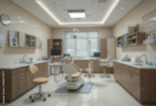 Blurred dental clinic background. Defocused interior of modern dental office. Blurred dental clinic background in beige