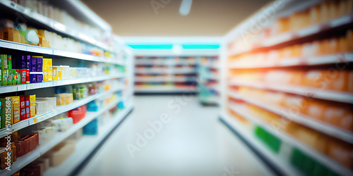 grocery, aisle, shelf, supermarket, shopping centre, department store, interior, background, blur, defocused, modern, shopping, retail, consumer, product, store, commerce, shop, market, client, buy, sell, purchase, good, merchandise, ware, stock, trade, shopping centre, mall, shopper, retail outlet, copy space, generative, ai
