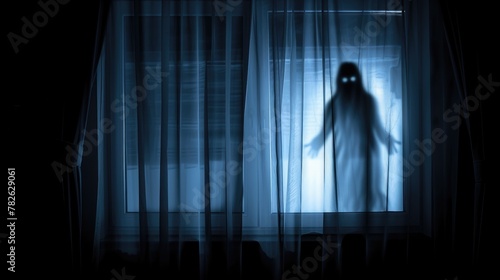 Blurred ghost silhouette in bedroom window at night, setting a spooky Halloween scene, Ai Generated