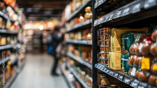 Blurred Grocery Supermarket Aisle with Local Organic Food Products on Shelves