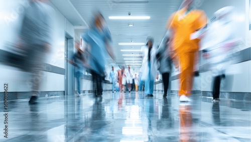 hospital, hallway, people, medicals, blurred, motion, movement, tied-up, corridor, doctor, nurse, patient, white, orange, blue, light, modern, clean, staff, health care, professional, health, emergency, speed, activity, hospitality, care, uniform, walking, sharpened, depth, floor, tile, bright, illuminated, interior, architecture, public, space, modernity, personnel, professionalism, cleanliness