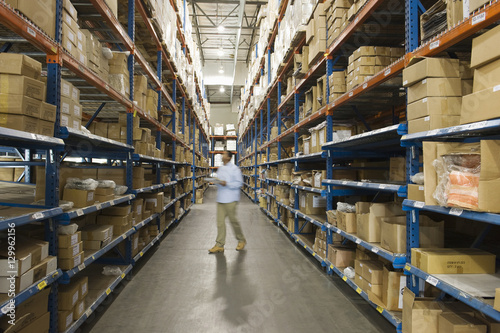 30s, adult, african, aisle, american, black, blurred, box, box, cardboard, distribution, factory, full-length, good, horizontal, indoor, industrial, industry, inspecting, inventory, line, male, man, motion, 1, package, person, production, rack, row, shelf, shelving, stack, storage, us, walking, warehouse, men at work, working
