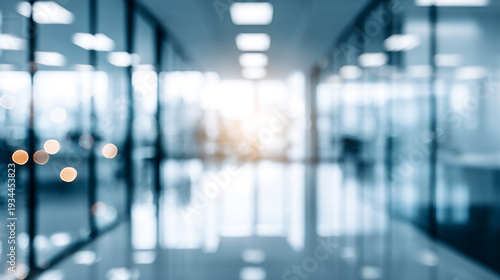 Blurred Modern Office Corridor With Glass Walls And Bokeh Lights, Corporate Background With Copy Space