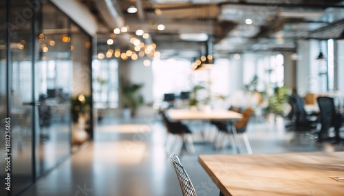 Blurred modern office interior with open space. Bright coworking area with glass walls, furniture, and plants. Contemporary business environment for productive work and meetings. High quality