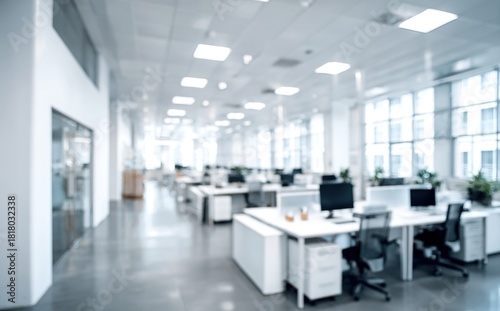Blurred office interior with desks and partitions in a bright white space. High quality