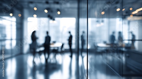 Blurred office scene showing silhouettes of people in a modern business environment with glass walls