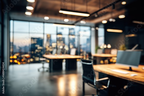Blurred office space with warm-toned wooden desks and chairs, a large window view of a city skyline lit up at dusk, creating a modern, corporate atmosphere