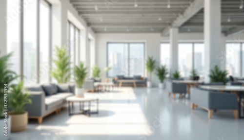 Blurred open space office interior as background. Workspace with desk, chair, table, plants. Modern corporate design in bright light. Clean minimalist architecture, roomy, airy layout, technology,