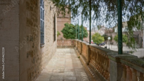 Blurred path along rustic stone building with defocused greenery and architectural details, embodying serene university campus ambiance in europe during daytime.