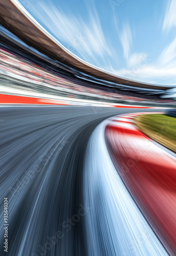 Blurred racetrack with red and white stripes in motion, wide-angle, low camera position, fast-moving speed blur effect