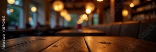 Blurred restaurant lights illuminate a wooden table creating a cozy atmosphere, wooden table, abstract