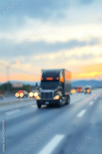 truck, highway, road, sunset, transport, trucking, delivery, logistic, transportation, cargo, vehicle, driving, travel, motion, blur, speed, fast, landscape, evening, dusk, sun, sky, cloud, traffic, car, automobile, asphalt, lane, line, wheel, light, commercial, industry, freight, shipping, distribution, movement, journey, way, path, route, scene, image, photo