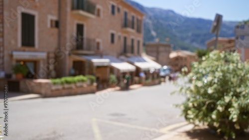Blurred street view in mallorca with defocused buildings and people under sunny skies creating a bokeh effect in the background