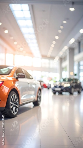 showroom, car, interior, modern, automotive, display, vehicle, exhibition, sale, parking, light, bright, floor, white, orange, silver, blurred, background, large, roomy, commercial, business, retail, retailer, glasses, skylight, detail