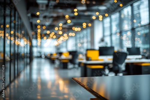 office, modern, interior, workspace, desk, computer, lighting, ceiling, blurred, perspective, glasses, window, corporate, design, furniture, technology, workplace, business, contemporary, empty, indoor, architecture, tile, floor, yellow, chair, equipment, lamp, structure, background, abstract, sharpened, meeting, space