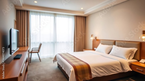 bedchamber, hotel, interior, room, bed, furniture, window, curtain, lighting, lamp, nightstand, television, chair, suite, accommodation, travel, relaxation, comfort, luxury, design, contemporary, modern, elegant, minimalist, beige, brown, white, blurred, soft focus, serene, peaceful, cosy, sleep, rest, vacation, hospitality, stylish, classic, home, decor, textile, pillow, cushion, quilt, headboard, desk, table