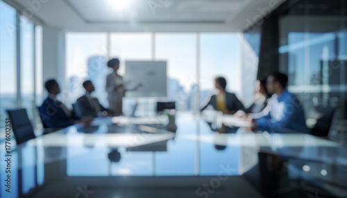 Blurry business meeting with people around a reflective conference table, showing silhouettes and light reflections that emphasize teamwork, leadership, and modern corporate design.