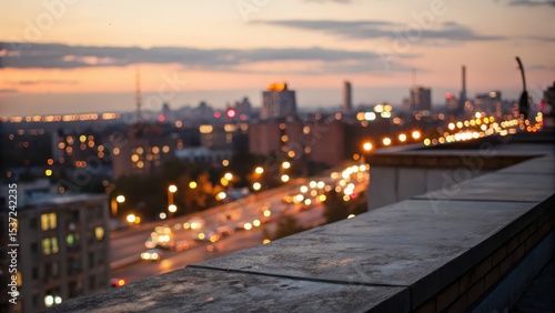 Blurry cityscape at dusk with lights and a rooftop edge in the foreground.