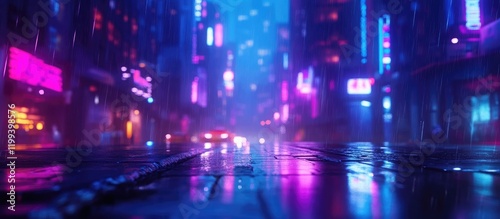 Blurry cyberpunk cityscape at night with neon pink and blue tones reflecting on wet streets creating a futuristic urban ambiance ideal for text placement