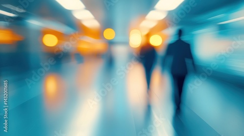 motion, blur, figure, walking, people, hallway, tunnel, corridor, urban, city, modern, architecture, interior, design, light, vibrant, colours, blue, orange, yellow, movement, speed, abstract, contemporary, perspective, background, business, professional, commuter, urban scene, travel, transit, transportation, passageway, indoor, blurred, bokeh, silhouette, businessperson, building