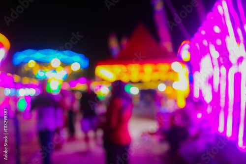 Blurry image of food stall at night festival with bokeh. Abstract photo blurry people in night festival city park bokeh background with colorful lights at night.