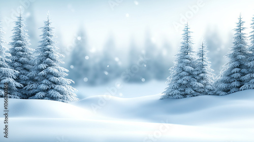 Blurry snowy landscape with tall evergreen trees, creating serene winter atmosphere. soft snow blankets ground, enhancing peaceful scene