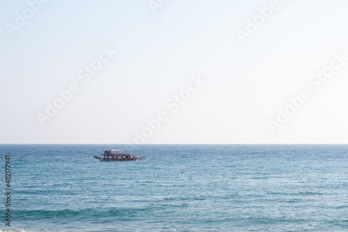 sea, boat, ship, water, sky, ocean, travel, summer, yacht, island, sailing, nature, horizon, beach, vessel, fishing, coast, cloud, fisherman, blue, wave, day, transportation, landscape, red