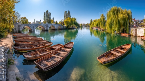 river, boat, water, bridge, tree, sunny, day, landscape, panorama, dock, wood, stone, arch, willow, blue, green, peaceful, serene, calm, tranquil, nature, scenic, travel, vacation, tour tourism, countryside, europa, summer, autumn, daylight, clear, sky, sunlight, shoreline, foliage, waterway, recreation, leisure, outdoors, bank, architecture, structure, heritage, historical, destination, idylli, picturesque, riverside