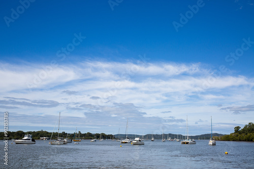 boat, tied, mooring, moreton, bay, blue, sky, water, peaceful, cloud, blue skies, buoy, boat, yacht, moored, mooring, calm, mast, sail, island, island, sailing, dinghy, yacht, white cloud, wispy, sunny day, catamaran, calm water, anchorage