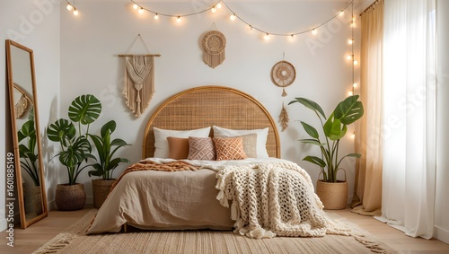 bedchamber, rattan, bed, beige, bedding, macrame, wall, hanging, string, light, plant, potted, monstera, woven, basket, throw, blanket, knitted, pillow, bohemian, neutral, earth, tone, natural, texture, mirror, curtain, light, sunlit, rug, floor
