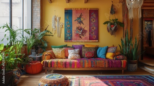 Bohemian Living Room Interior with Colorful Furniture, Plants and Wall Art.