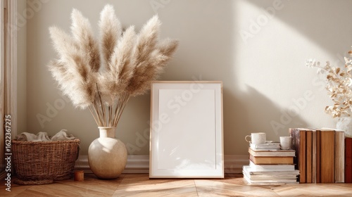 decor, pampas, grass, frame, book, basket, natural, light, interior, design, home, vase, cosy, neutral, beige, wood, floor, sunlight, shadow, stack, artwork, plant, dried, empty, blank, minimal, simple, arrangement, decorative, room, wall, ceramic, object, rustic, wicker, textile, soft, peaceful, tranquil, aesthetic, elegant, stylish, inviting, relaxation, calm, serene